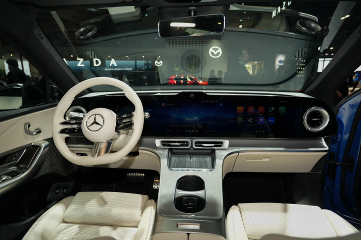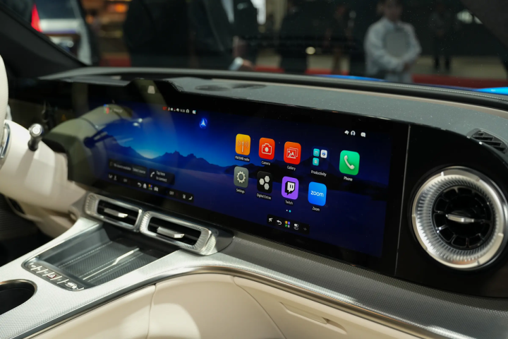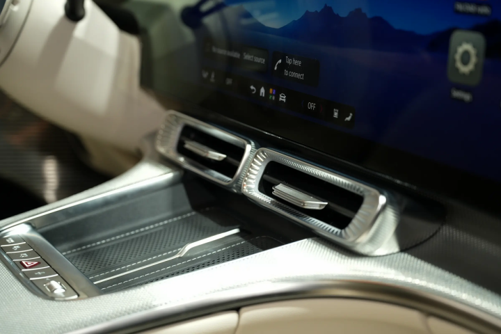 内饰方面,GLC EV采用了全新的MBUX Hyperscreen,其包含了一块39.1英寸无缝式曲面屏(12.3英寸仪表+26.8英寸触控),完成了对于仪表、中控以及副驾娱乐的融合。由于该屏幕采用了矩阵背光技术,其支持分区域亮度调节,主驾驶前端还有AR-HUD抬头显示。而屏幕两端则布局有炮筒式出风口,下方为圆角矩形出风口,并带有双无线充电板与部分快捷操作按键。另外,扶手箱前端也完成了一体式集成处置,边缘带有粗壮的金属装饰带氛围灯,主体则为纵向木纹饰板。应该说在金属与木材的混搭装饰方面,奔驰确实还是很有一套的。