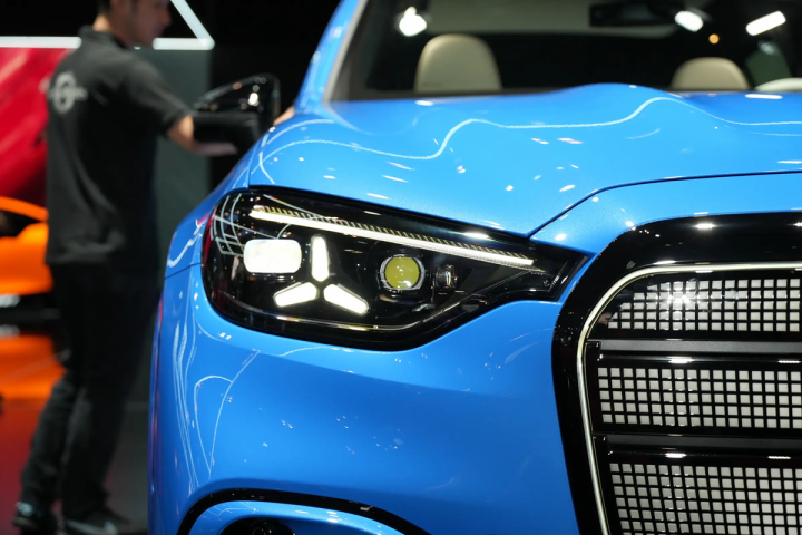 外观方面,GLC EV在车头采用了比较标志性的设计,但从结构样式来说,它跟过去还是有很大不同的。像主格栅位置依旧是盾形,但它不光更换上了粗壮的金属镀铬边框,还完成了纵向上的大幅度拓展,其中是密集像素光珠排列而成的照明面板,这样的风格实际是来自于曾经在性能领域交出了出色成绩单的奔驰300 SEL。